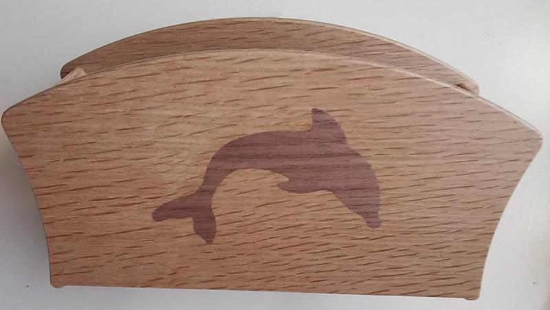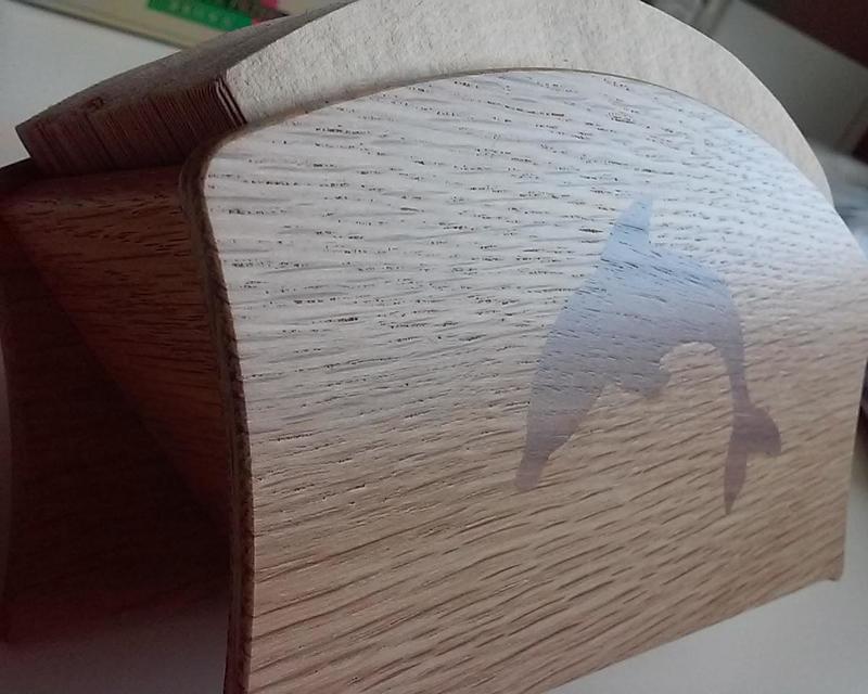 Walnut dolphins for inlays (3ply), earrings (5ply), etc. Inlay example was done as four 94mm coasters. The 80mm dolphins are machined full depth (no tabs) on a vacuum fixture using a 2mm bit.