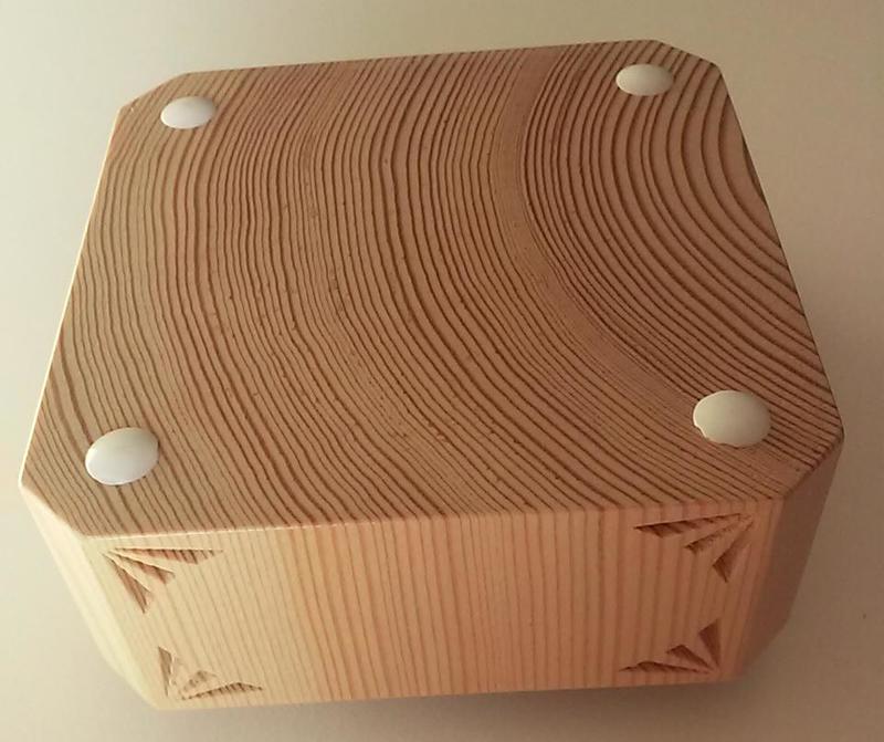 Douglas Fir spiral cut endgrain bowl with chip carving inspired corner carves on the top and four sides. Finish: WB acrylic, Size: ~3-3/8 x 3-3/8 x 1-3/8".[ comment | link | top ]
