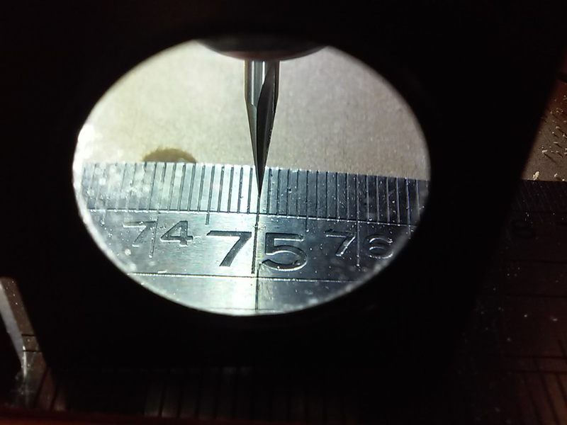 Axis CalibrationThe calibration distance should be as big as possible, the closer to the axis limits the better. I used what I hope is an accurate steel rule and fixed one end (clamp just before 100mm/axis 0) securely to the spoilboard. Eyeball measurements aren't very accurate so I used a 20 degree engraving bit, a flashlight and a magnifier. Getting the flashlight centered behind the bit, getting the bit as low as possible and rotating the bit (because of the flutes, the tip appears to move from side to side and centering it in the grove can be tricky) all helped.