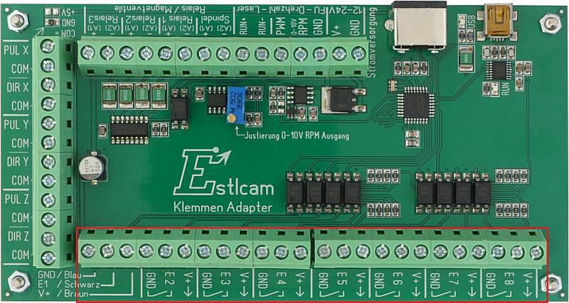 The Estlcam Terminal Adapter is the only Estlcam specific control board (pictured)... The only source I know of is Rocketronics and they no longer ship to the US... Rocketronics also has the new XL version that supports auto squaring. For specs and other new hardware see: Estlcam open source hardware. NOTE: Estcam v11 cannot be used with the new hardware (only v12).