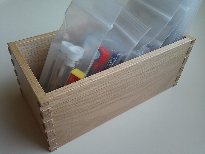 Oak box tray with proud dovetail corner joints and Cherry bottom. The tray was sized to accommodate 3 x 5" storage bags and measures ~3-5/8 x 7-3/8 x 3". The tray is finished, inside and out, with WB acrylic.