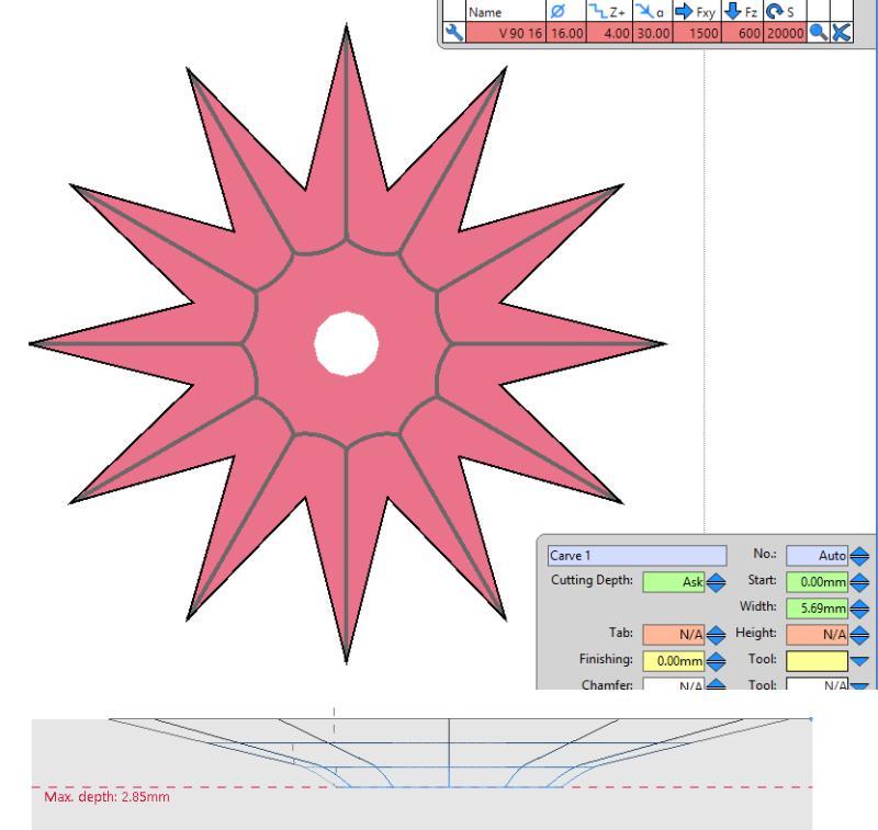 V12 internal calculations for V-bit Max depth and Max Carve Width are inconsistently smaller than they should be. While all angles/diameters seem to be affected (e.g. 8.1 instead of 9 for a 20deg 3.18dia), 90 degree V-bits are the easiest to verify/calculate because Max depth should always be half the tool diameter, e.g. 8mm for a 16mm tool, not the Estlcam v12 calculated 7.2mm. V11 internal Max depth calculations are consistent and match the Carve Calculator Max Depth/hb calculation.